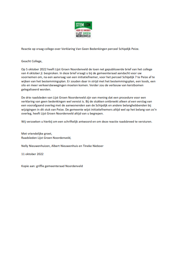 Lijst Groen Noordenveld heeft op 11 oktober jl. gereageerd op een voornemen van het college om het hoveniersbedrijf dat weg moet aan De Pol in Peize, een plek te geven aan de Schipdijk. LGN is niet akkoord nu er geen voorafgaande afstemming met de buurt is geweest.